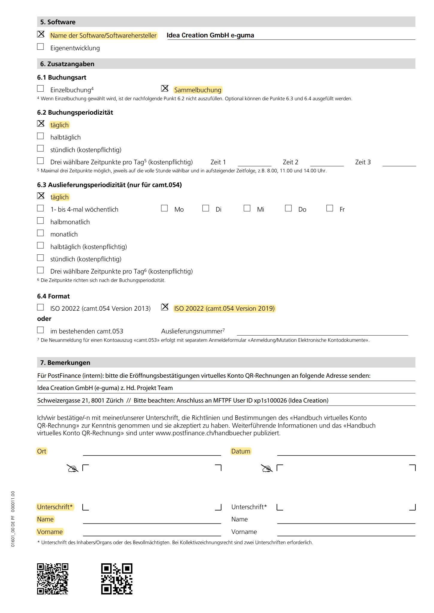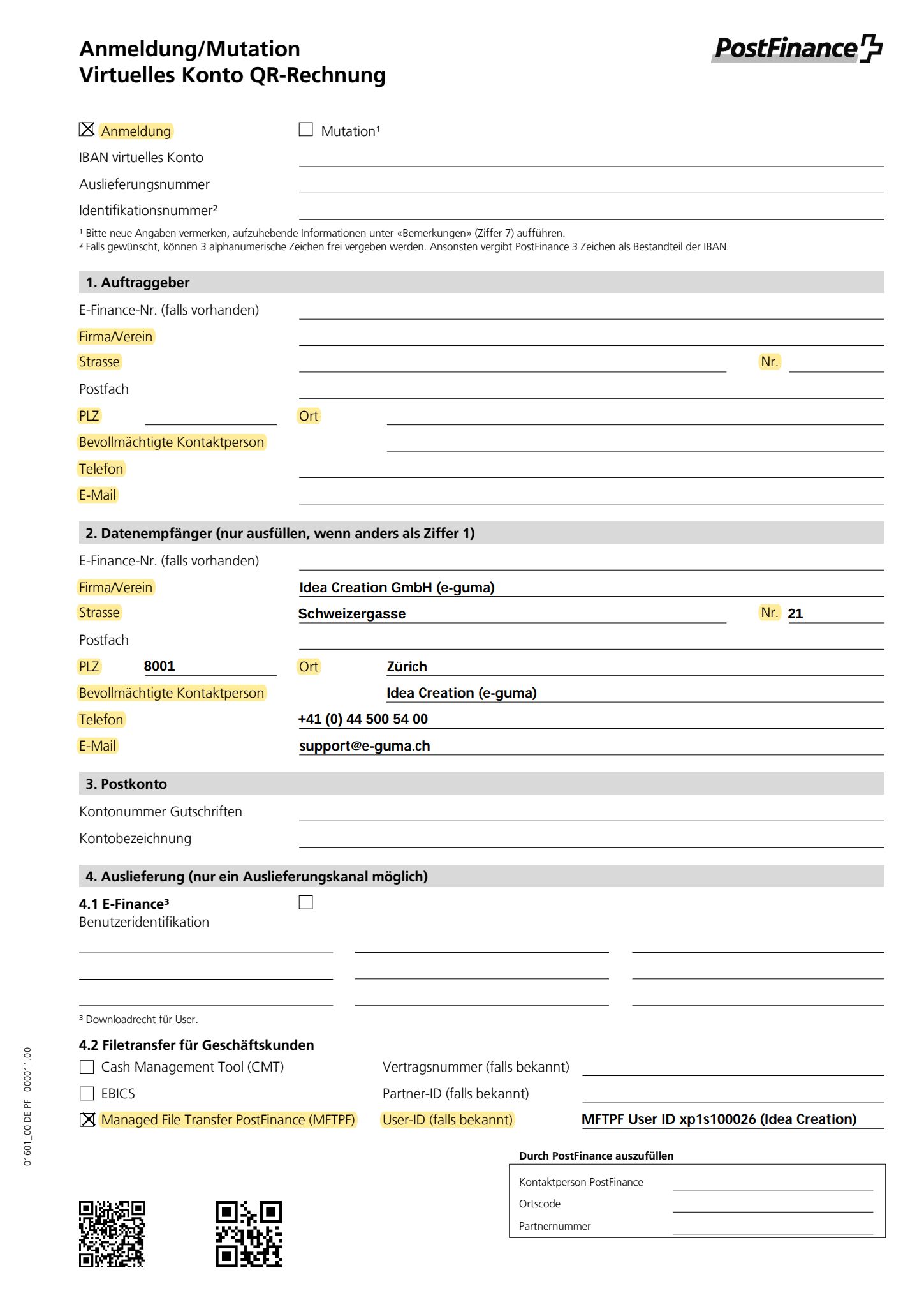 Kontaktieren Sie uns, damit wir PostFinance Ihre Anmeldung für die QR-Rechnung mitteilen können. Sie erhalten daraufhin von der PostFinance ein Formular, um ein virtuelles Konto für die QR-Rechnung zu eröffnen. Füllen Sie das Formular gemäss nachfolgendem Muster aus: