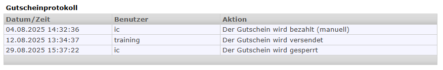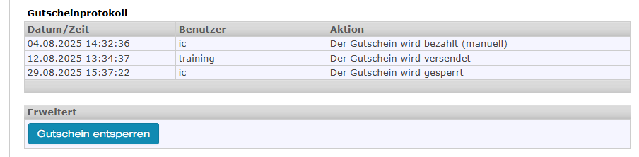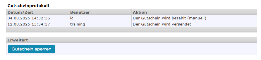 Die Sperrung wird sofort aktiv und im Protokoll vermerkt. Der Status des Gutscheins ändert sich: auf der Detailseite erscheint der Zusatz gesperrt.