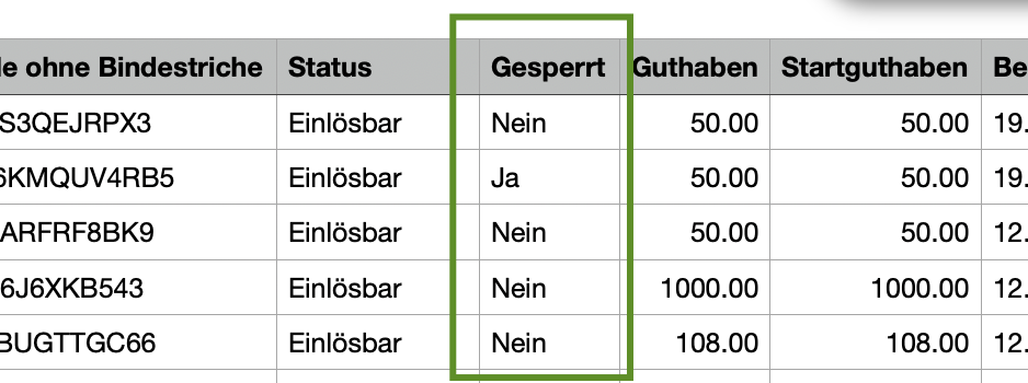 Im Gutscheinexport erscheint eine zusätzliche Spalte Gesperrt, sodass gesperrte Gutscheine leicht identifiziert werden können.