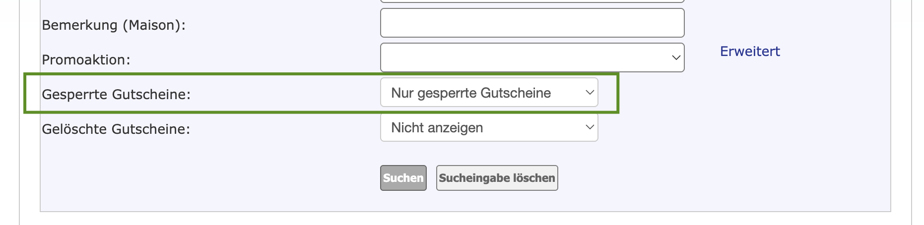 In der Suche der Gutscheinverwaltung können Sie nach gesperrten Gutscheinen filtern.