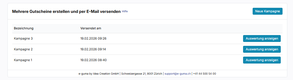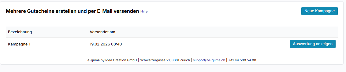 Sobald das Tool freigegeben ist, finden Sie unter Extras den Eintrag Mehrere Gutscheine erstellen und per E-Mail versenden. Auf einer Übersicht werden die durchgeführten Kampagnen aufgelistet.