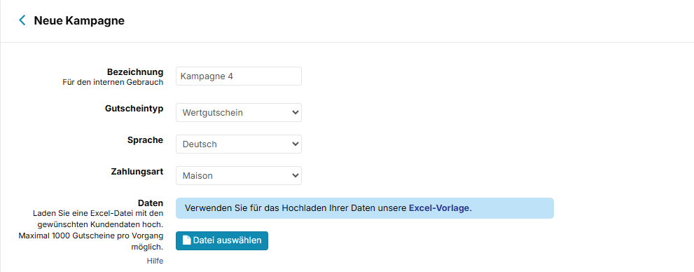 Um eine neue Kampagne anzulegen, klicken Sie auf Neue Kampagne. Legen Sie nun die Parameter für die zu versendenden Gutscheine fest.