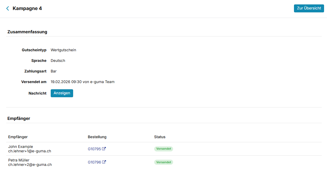 Die Detailseite zeigt die festgelegten Parameter sowie für jeden Empfänger die generierte Bestellung und den Versandstatus.