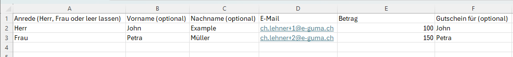Jede Zeile generiert einen Gutschein bzw. Bestellung. Es werden maximal 1'000 Zeilen unterstützt. Folgende Daten können Sie pro Gutschein individuell definieren: