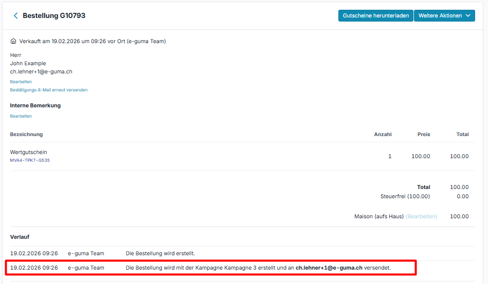 Für jeden erstellten Gutschein wird automatisch eine Bestellung erstellt. In der Bestellhistorie ist ersichtlich, dass die Bestellung über eine Kampagne erstellt und per E-Mail versendet wurde.