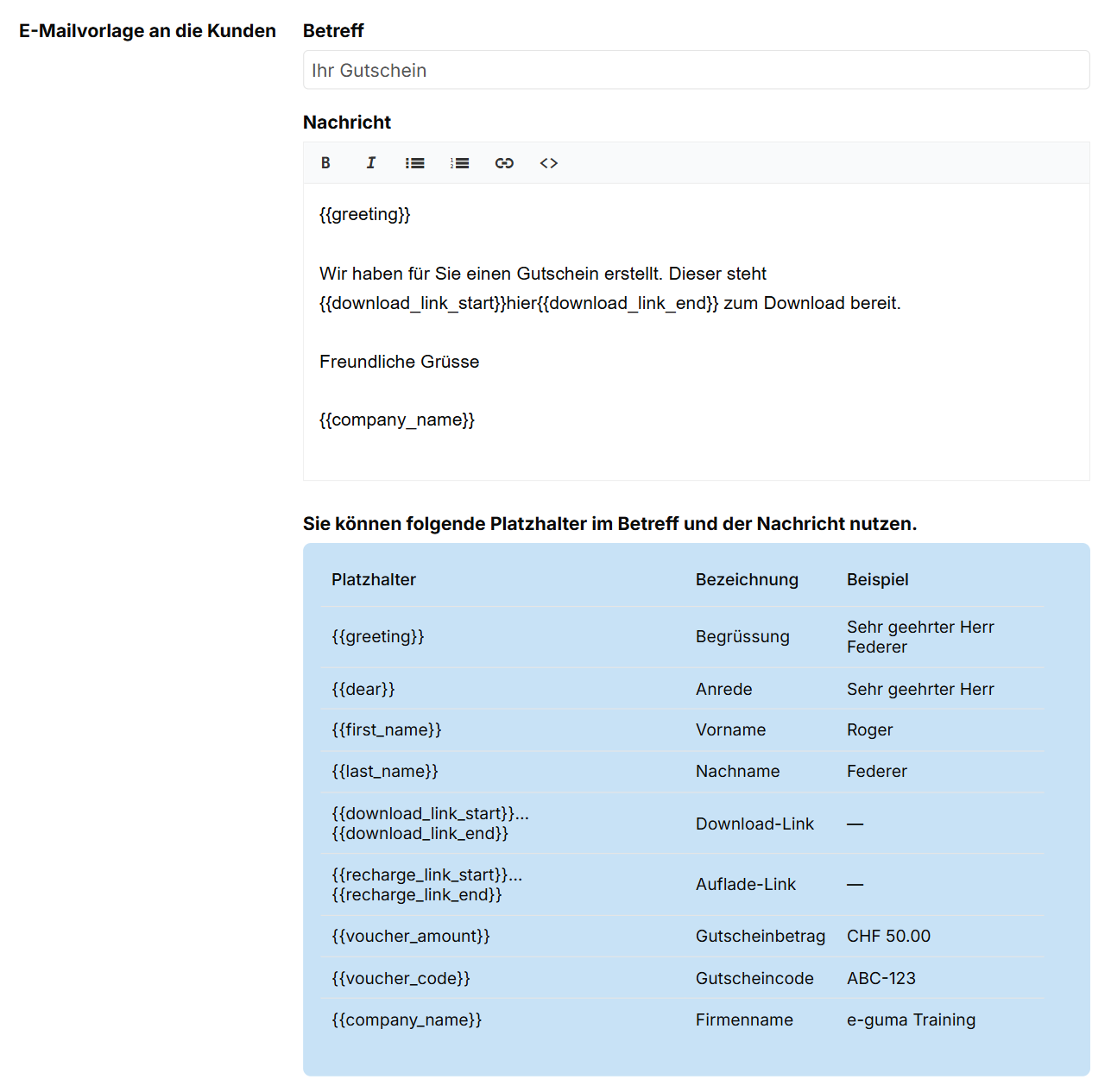 | Gutschein für | Optionales Textfeld, welches in "Gutschein für" übertragen wird.