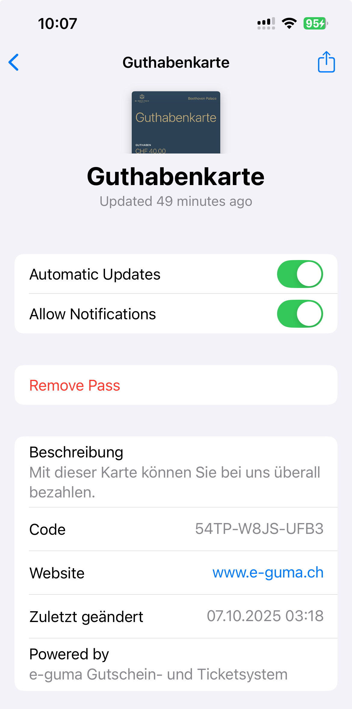 Folgend ein Beispiel einer digitalen Karte, die in der Wallet-App auf dem iPhone gespeichert wurde. Je nach Konfiguration können die Texte und Elemente auf der Karte abweichen.