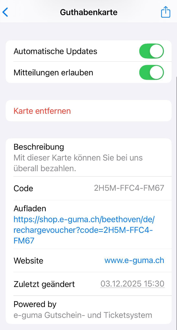 - Teilen: Eine digitale Guthabenkarte kann mit anderen Personen geteilt und auf mehreren Smartphones gespeichert werden.