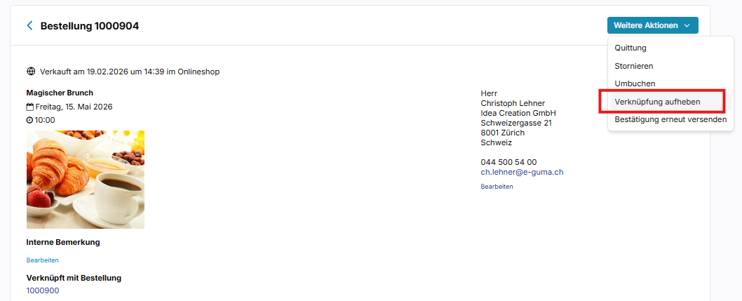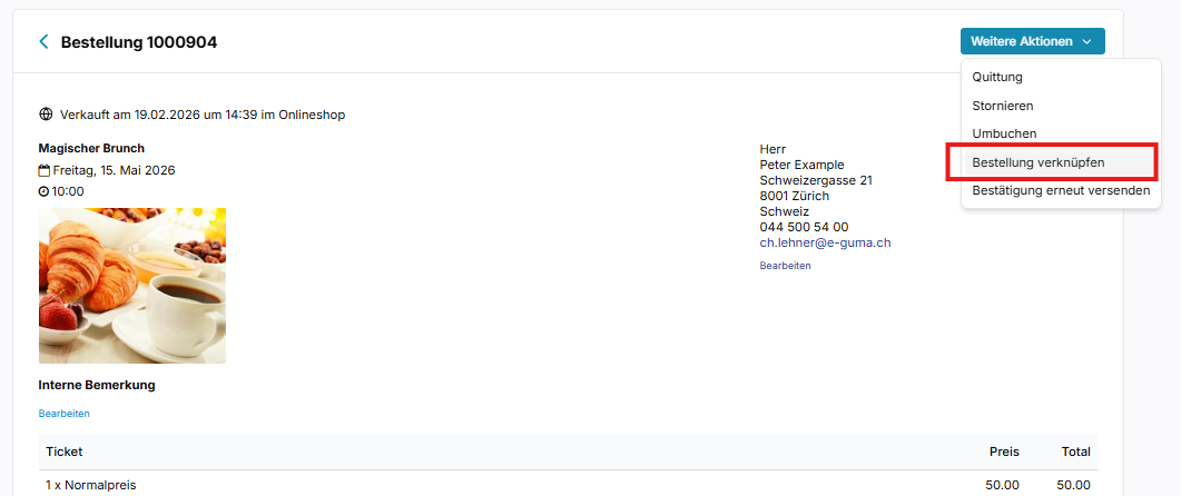 Sobald die Funktion freigeschaltet wurde, erscheint auf der Detailseite einer Ticket-Bestellung in der Toolbar unter Weitere Aktionen der Eintrag Bestellung verknüpfen.