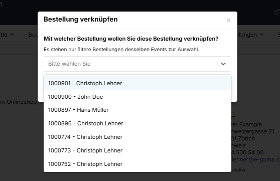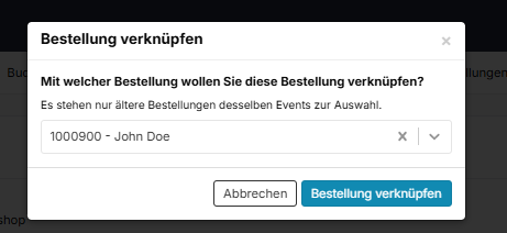 Mit der Aktion öffnet sich ein Dialog, um eine andere vorhandene Bestellung auszuwählen. Hier werden nur ältere Bestellungen desselben Events, bei Eintritten mit Kalender desselben Slots, vorgeschlagen. Stornierte Bestellungen werden ausgeblendet.