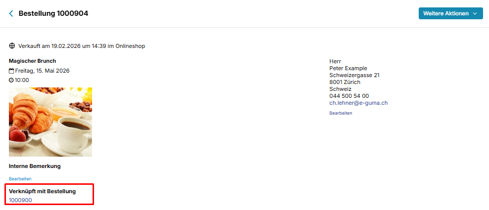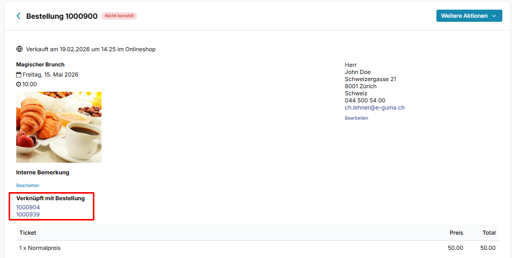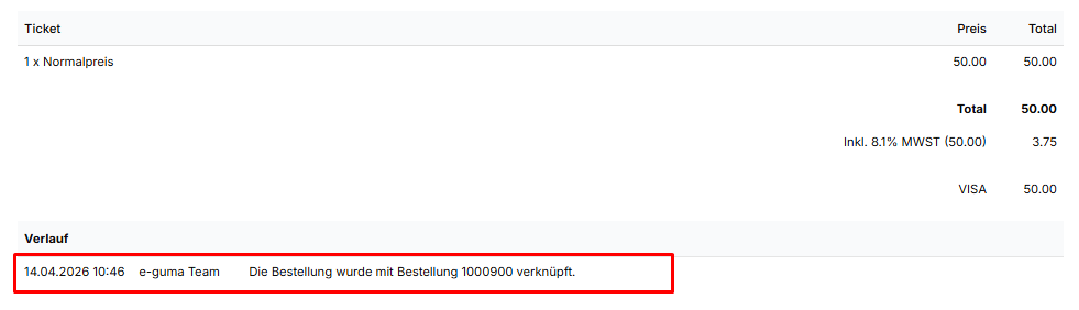 Sobald eine Bestellung mit einer anderen Bestellung verknüpft ist, wird die verknüpfte Bestellnummer auf der Detailseite angezeigt und verlinkt.