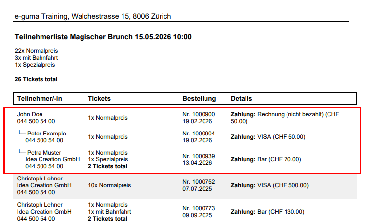 In der PDF-Teilnehmerliste werden die verknüpften Bestellungen zusammen abgebildet, unabhängig davon, welche Sortierung gewählt wird.