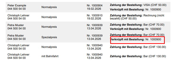 Darstellung von verknüpften Bestellungen in der PDF-Teilnehmerliste