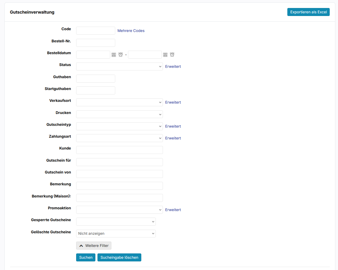 Natürlich kann die Exceldatei auch ohne vorgängige Suche exportiert werden - dann werden sämtliche Gutscheine in der Excel-Datei aufgeführt.