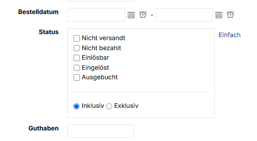 | Bestelldatum | Falls Sie nur das erste Datumsfeld von ausfüllen, zeigt es alle Gutscheine von dem eingegebenen Zeitpunkt bis heute an Falls Sie nur das Datumsfeld bis ausfüllen, zeigt es Ihnen alle Gutscheine seit Liveschaltung bis zum eingegebenen Zeitpunkt an |
