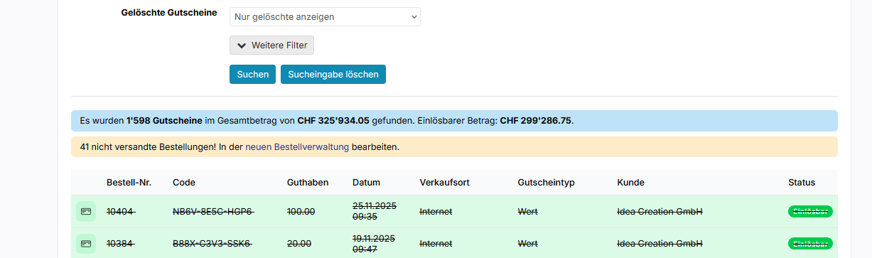 Gelöschte Gutscheine können Sie mit der Gutscheinsuche jederzeit wieder anzeigen lassen. Wählen Sie dazu beim untersten Suchkriterium Gelöschte Gutscheine entweder Anzeigen oder Nur gelöschte Gutscheine anzeigen. Gelöschte Gutscheine werden durchgestrichen dargestellt.