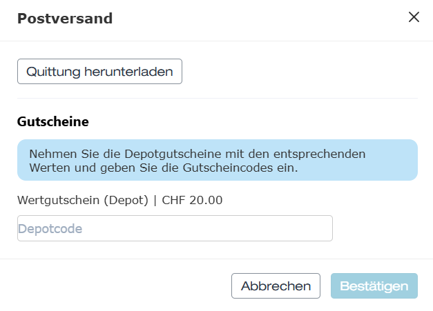 Nehmen Sie einen vorbereiteten Depotgutschein mit dem entsprechenden Wert oder mit einem freien Betrag und geben Sie dessen Gutscheincode ein und klicken Sie auf Bestätigen.