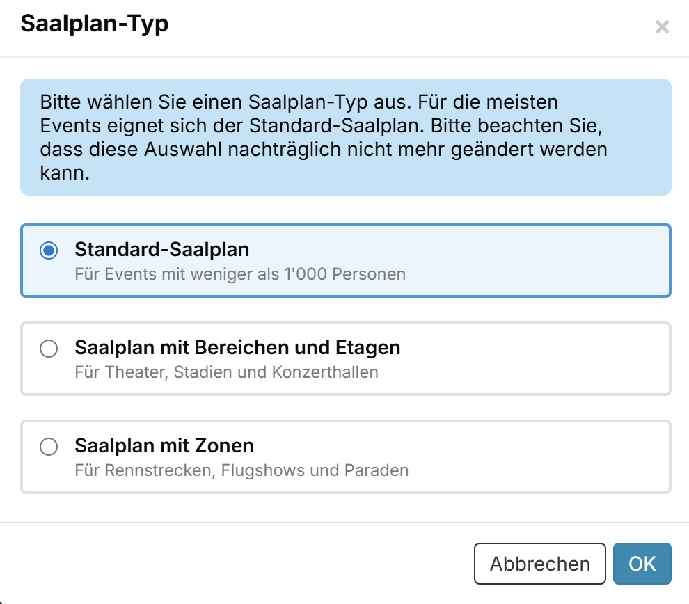 Für die meisten Events eignet sich der Standard-Saalplan. Der Saalplan mit Bereichen und Etagen eignet isch für grössere Theater, Stadien und Konzerthallen mit mehreren Rängen. Der Saalplan mit Zonen bietet sich an für grosse Outdoor-Veranstaltungen mit verschiedenen Zonen wie z. B. Rennstrecken, Skirennen etc.