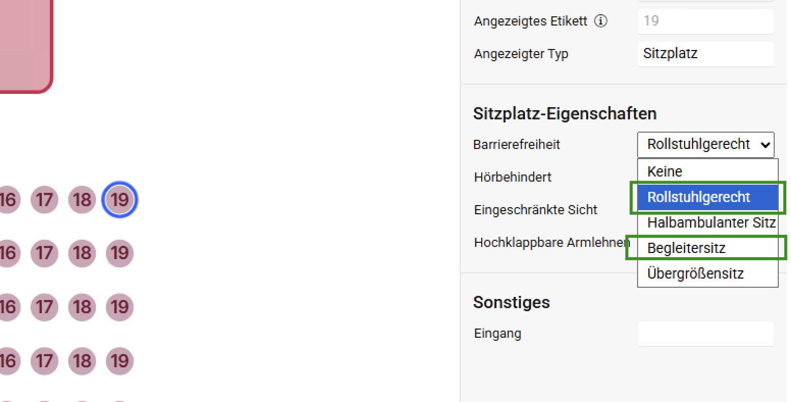 Im Saalplandesigner können Sie einen Platz als rollstuhlgerecht konfiguriert werden. Zusätzlich kann der Sitzplatz nebenan für die Begleitperson definiert werden. Letzterer kann beim Buchen nur ausgewählt werden, wenn zuvor der rollstuhlgerechte Sitzplatz ausgewählt wurde. Wird nur der rollstuhlgerechte Sitzplatz gebucht, ist der Begleitersitz für jedermann verfügbar.